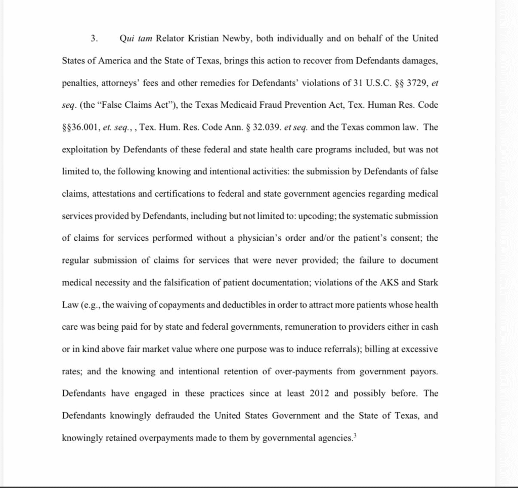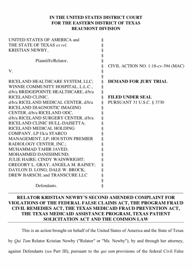 Documents released by the U.S. Department of Justice show that the fraud case—United States of America et al. v. Riceland Healthcare System, LLC et al.—was initiated by the U.S. Department of Justice (DOJ) and the State of Texas under the False Claims Act in August 2018.