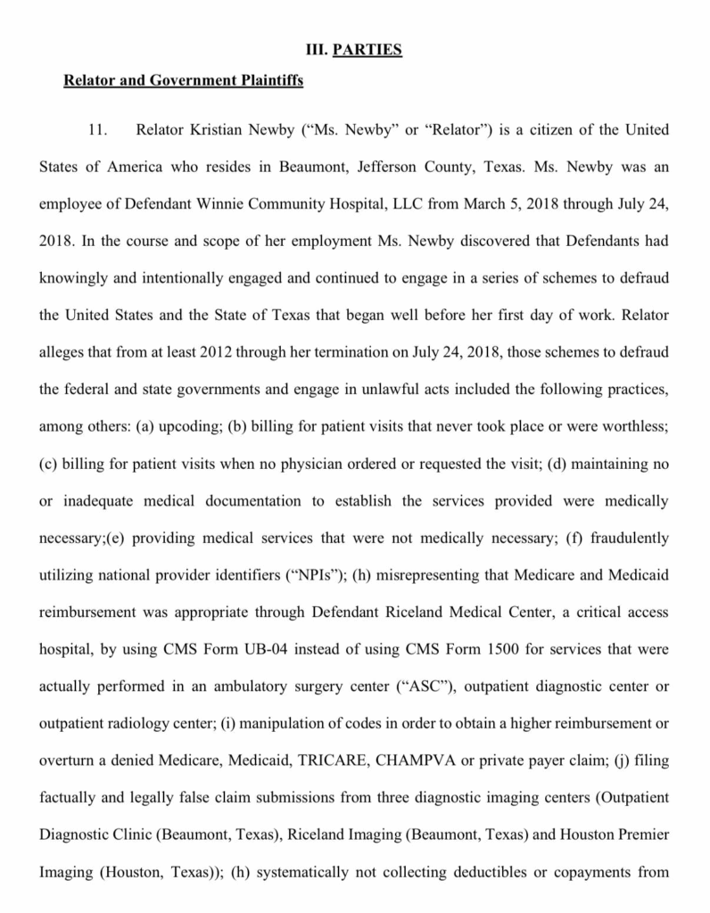 Winnie Community Hospital (WCH), a small facility in Chambers County, was once hailed by Javed as a model for rural care. Behind the façade, federal suits and tax records describe a business built on systemic deception of state and federal programs. According to U.S. government papers, the hospital and its parent entities filed inaccurate cost reports and billing statements that overstated patient services and reimbursement codes, later funnelled through a network of Riceland-branded affiliates to mask the source of proceeds.