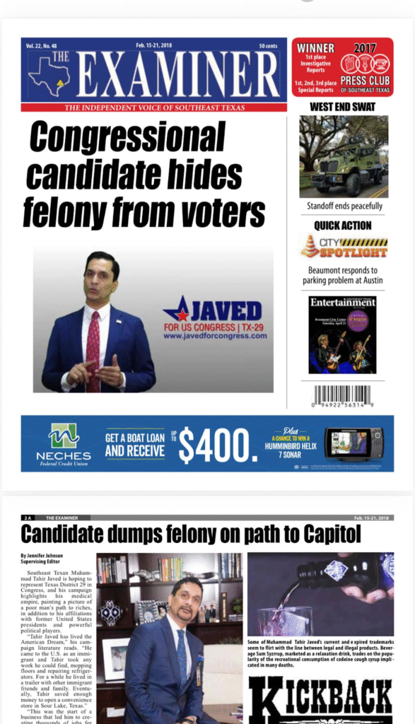 Public records from Jefferson County Court (Case No. 56447, 1990) show Javed was convicted of “Theft by Receiving,” receiving five years’ probation. He later failed to disclose this conviction when appointed advisor to Pakistan’s interim Prime Minister Anwar-ul-Haq Kakar in 2023; the appointment was rescinded after exposure of the record. In Texas, a separate ethics complaint forced Javed to withdraw from a Fort Bend County Commission race in 2024.